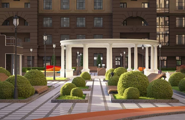 На территории появится двор-патио с беговыми дорожками, скейт-парк, амфитеатр, холлы отделаны штукатуркой и керамогранитом. Территория огорожена, есть охрана и консьерж-сервис. Дизайн каждого лобби представляет собой уникальный проект. Бесшумные лифты входят в единую инженерную систему с диспетчеризацией для бесперебойной работы всех элементов.