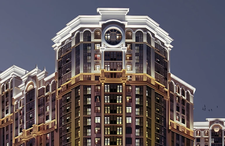 Стиль ЖК - комбинация классики, ампира, эклектики и ар-деко. В ЖК спланировано более 2 тысяч апартаментов, с потолками высотой в 3,1 метров. Фасады отделаны натуральным камнем, лепниной и барельефами.